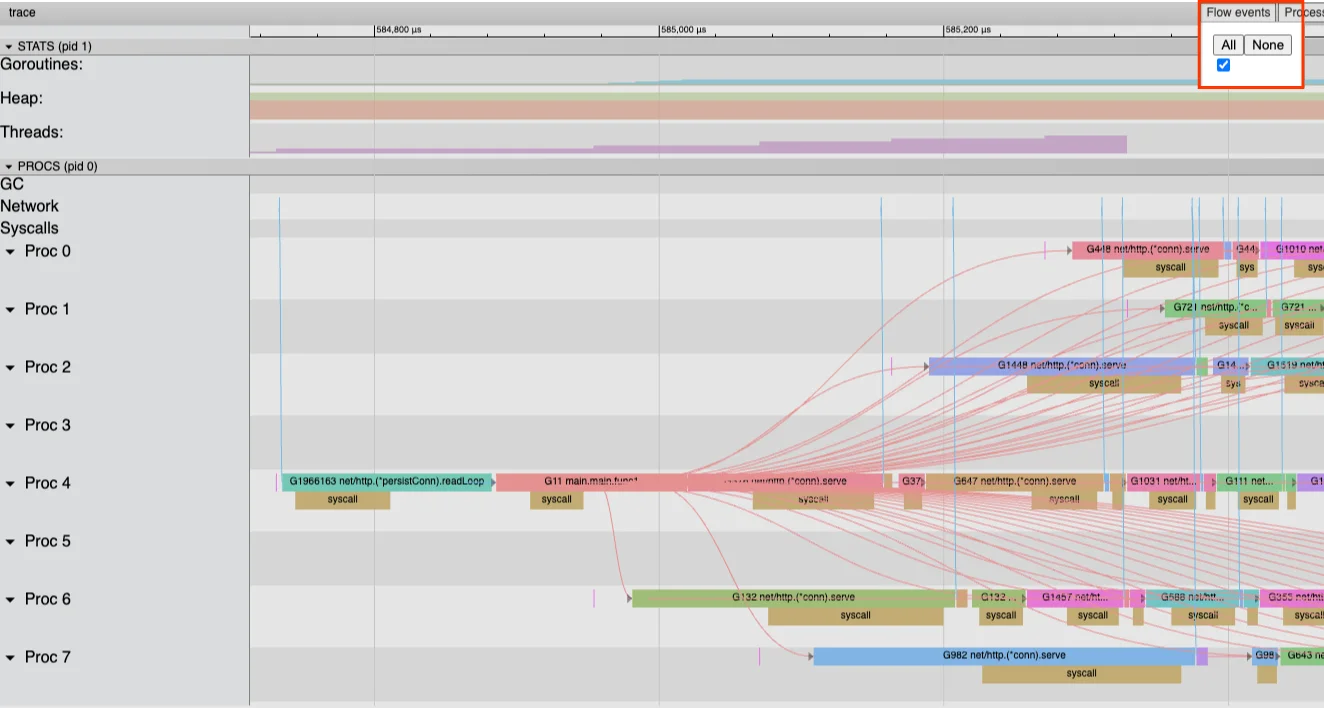 In addition to the activity of each individual goroutine, we can see how goroutines interact via “flow events.” An incoming flow event indicates what happened to make a goroutine start running. An outgoing flow edge indicates what effect one goroutine had on another. Enabling the visualization of all flow events often provides clues that hint at the source of a problem.