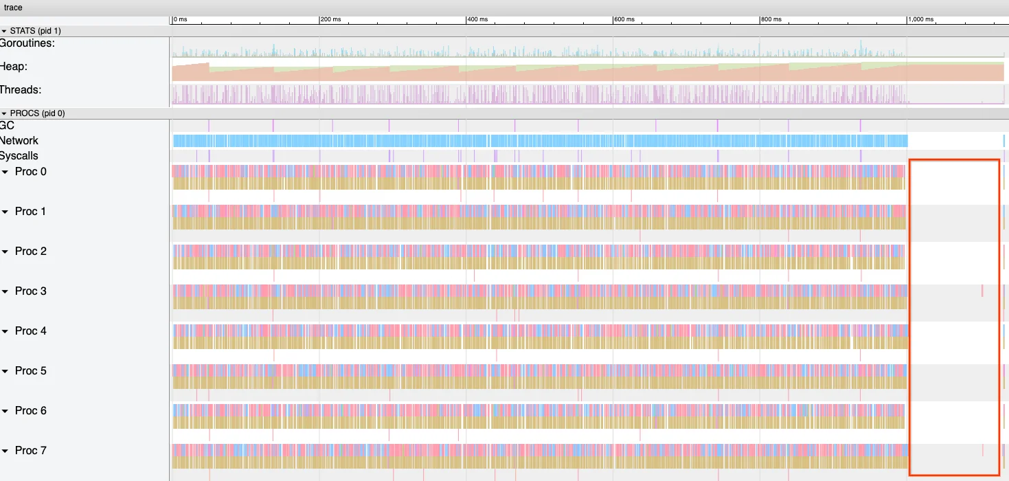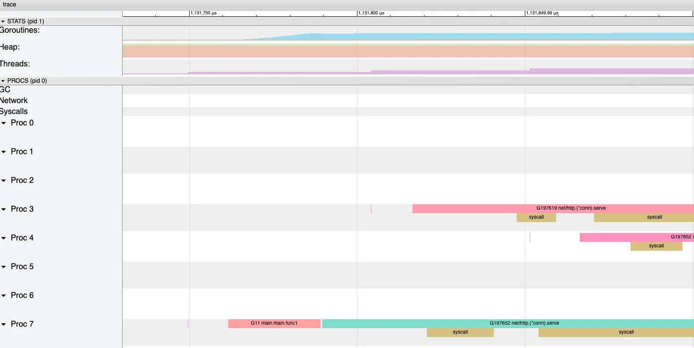 Below that, in the “PROCS” section, we can see how the execution of goroutines is mapped