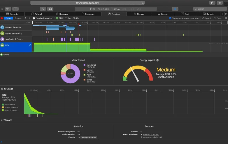It shows us the percentage of CPU used and the duration of CPU usage when loading the web page, and uses these figures to generate an energy impact rating. It doesn’t give us precise data for the amount of electricity used in kilowatts, but the information it does provide can be used to benchmark how efficiently your websites use energy and set targets for improvement.