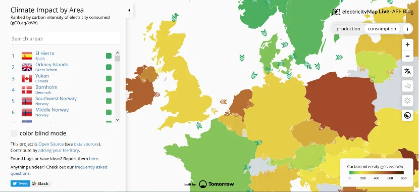 We don’t have control over the full energy supply of web services, but we do have some control over where we host our projects. With a data center using a significant proportion of the energy of any website, locating the data center in an area with low carbon energy will tangibly reduce its carbon emissions. Danish startup Tomorrow reports and maps this user-contributed data, and a glance at their map shows how, for example, choosing a data center in France will have significantly lower carbon emissions than a data center in the Netherlands (Fig 2.3).