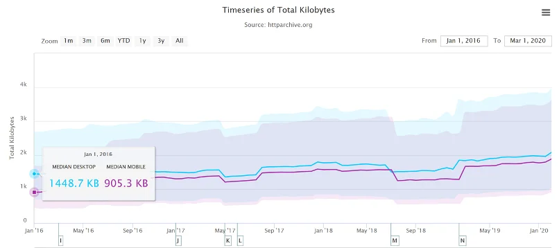 Reducing page weight requires a large scope. By early 2020, the median page weight was 1.97 MB for setups the HTTP Archive classifies as “desktop” and 1.77 MB for “mobile,” with desktop increasing 36 percent since January 2016 and mobile page weights nearly doubling in the same period (Fig 2.2). Roughly half of this data transfer is image files, making images the single biggest source of carbon emissions on the average website.
