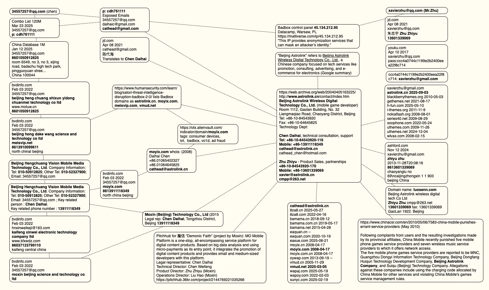 The mind map below includes search pivots on the email addresses, company names and phone numbers that suggest a connection between Chen Daihai, Zhu Zhiyu, and Badbox 2.0.