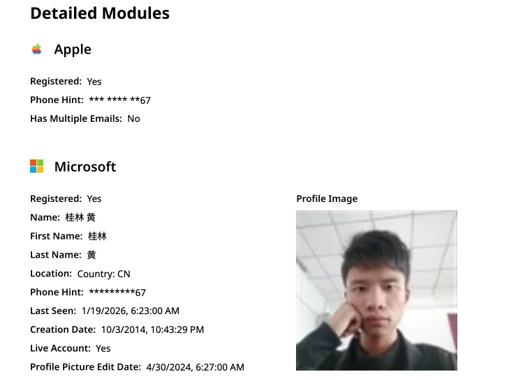 Constella finds [email protected] is associated with the China phone number 18681627767. The open-source intelligence platform osint.industries reveals this phone number is connected to a Microsoft profile created in 2014 under the name Guilin Huang (桂林 黄). The cyber intelligence platform Spycloud says that phone number was used in 2017 to create an account at the Chinese social media platform Weibo under the username “h_guilin.”