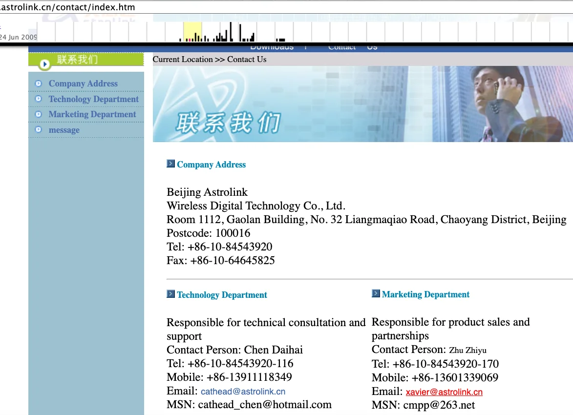 A cached copy of astrolink[.]cn preserved at archive.org shows the website belongs to a mobile app development company whose full name is Beijing Astrolink Wireless Digital Technology Co. Ltd. The archived website reveals a “Contact Us” page that lists a Chen Daihai as part of the company’s technology department. The other person featured on that contact page is Zhu Zhiyu, and their email address is listed as xavier@astrolink[.]cn.