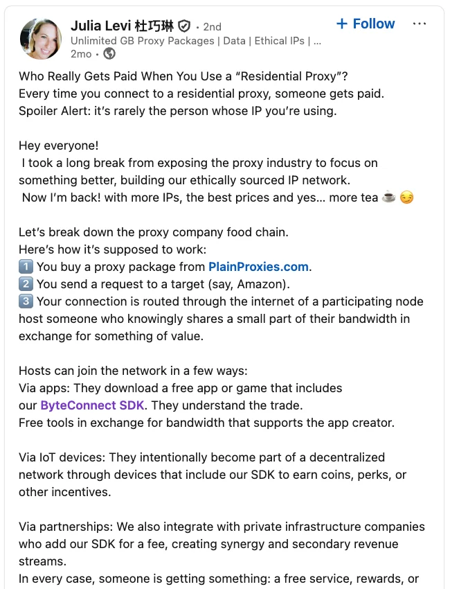 A post from the LinkedIn page of Plainproxies Chief Revenue Officer Julia Levi, explaining how the residential proxy business works.