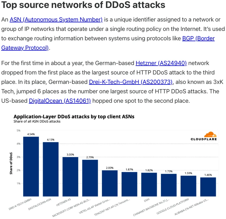 In July 2025, Cloudflare reported that 3XK Tech (a.k.a. Drei-K-Tech) had become the Internet’s largest source of application-layer DDoS attacks. In November 2025, the security firm GreyNoise Intelligence found that Internet addresses on 3XK Tech were responsible for roughly three-quarters of the Internet scanning being done at the time for a newly discovered and critical vulnerability in security products made by Palo Alto Networks.