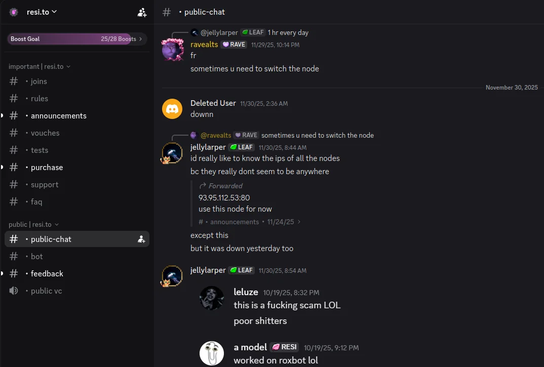 On November 24, 2025, a member of the resi-dot-to Discord channel shares an IP address responsible for proxying traffic over Android TV streaming boxes infected by the Kimwolf botnet.