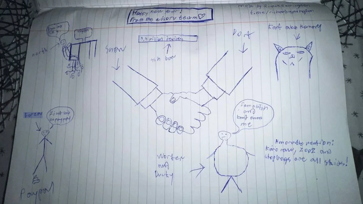 Hilariously, a user by the name “Richard Remington” briefly appeared in the group’s Telegram server to post a crude “Happy New Year” sketch that claims Dort and Snow are now in control of 3.5 million devices infected by Aisuru and/or Kimwolf. Richard Remington’s Telegram account has since been deleted, but it previously stated its owner operates a website that caters to DDoS-for-hire or “stresser” services seeking to test their firepower.