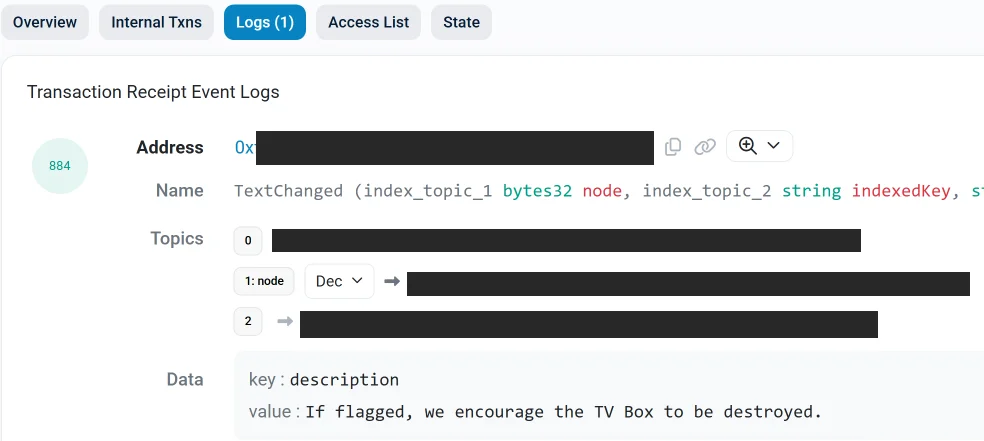 The text records included in Kimwolf’s ENS instructions can also feature short messages, such as those that carried Brundage’s personal information. Other ENS text records associated with Kimwolf offered some sage advice: “If flagged, we encourage the TV box to be destroyed.”
