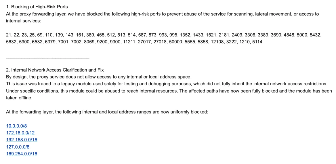 “By design, the proxy service does not allow access to any internal or local address space,” Byron explained. “This issue was traced to a legacy module used solely for testing and debugging purposes, which did not fully inherit the internal network access restrictions. Under specific conditions, this module could be abused to reach internal resources. The affected paths have now been fully blocked and the module has been taken offline.”