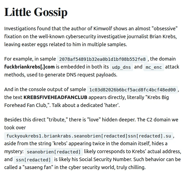 XLab noted that the Kimwolf author shows an almost ‘obsessive’ fixation” on Yours Truly, apparently leaving “easter eggs” related to my name in multiple places through the botnet’s code and communications: