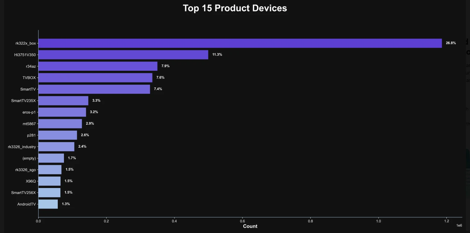 The top 15 product devices represented in the Kimwolf botnet, according to Synthient.