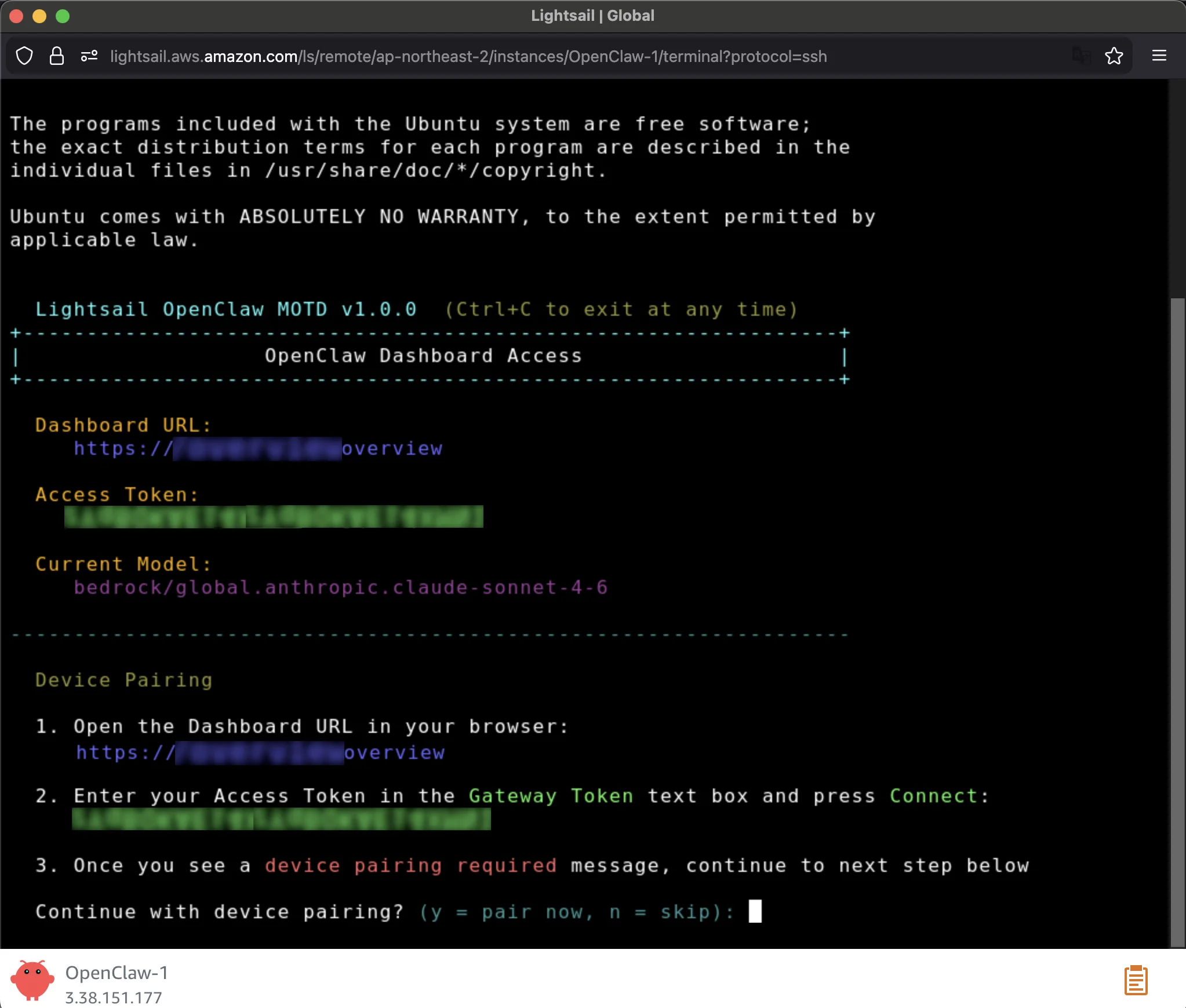 When prompted, press y to continue and a to approve with device pairing in the SSH terminal. When pairing is complete, you can see the OK status in the OpenClaw dashboard and your browser is now connected to your OpenClaw instance.