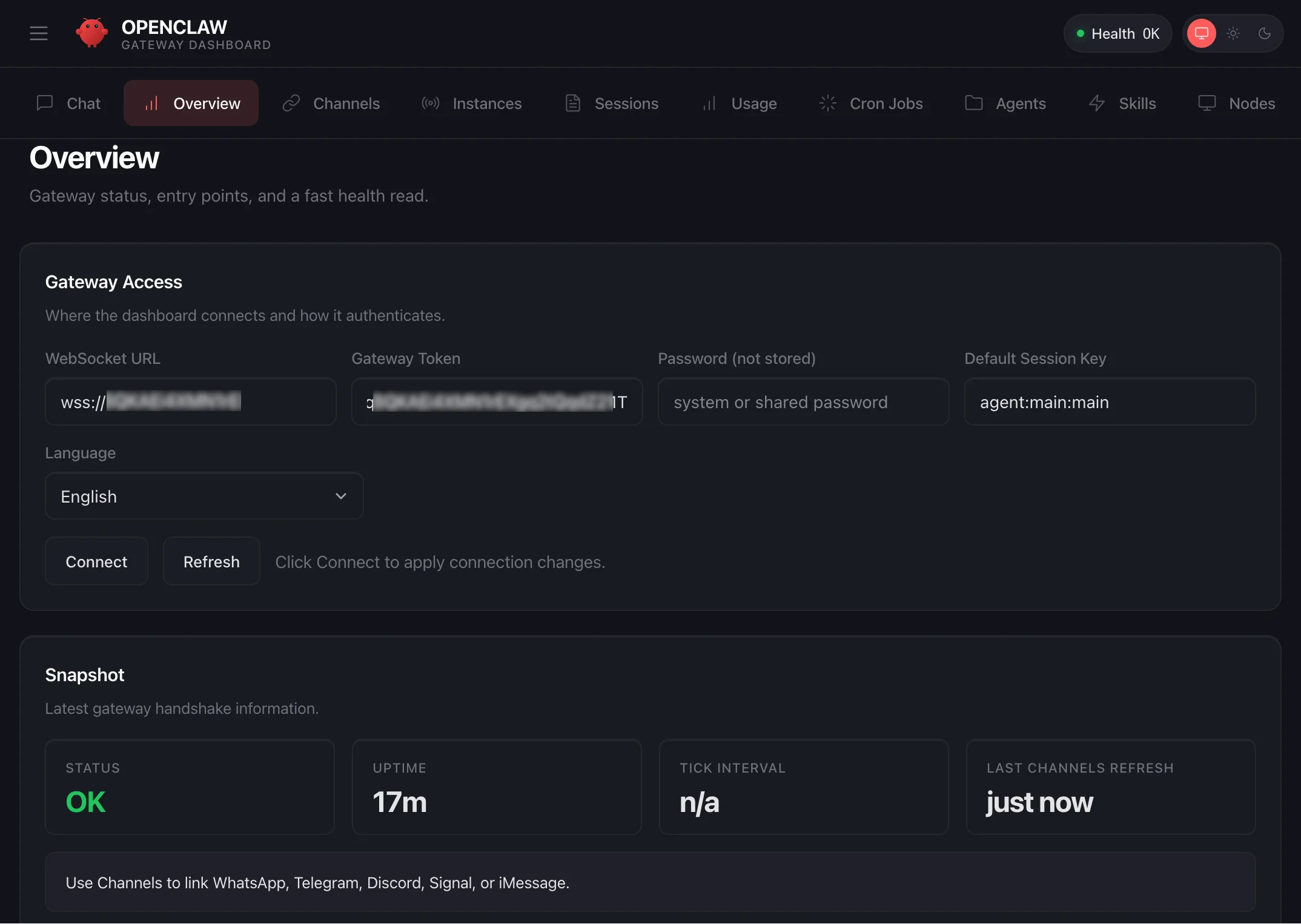 When a browser-based SSH terminal opens, you can see the dashboard URL, security credentials displayed in the welcome message. Copy them and open the dashboard in a new browser tab. In the OpenClaw dashboard, you can paste the copied access token into the Gateway Token field in the OpenClaw dashboard.