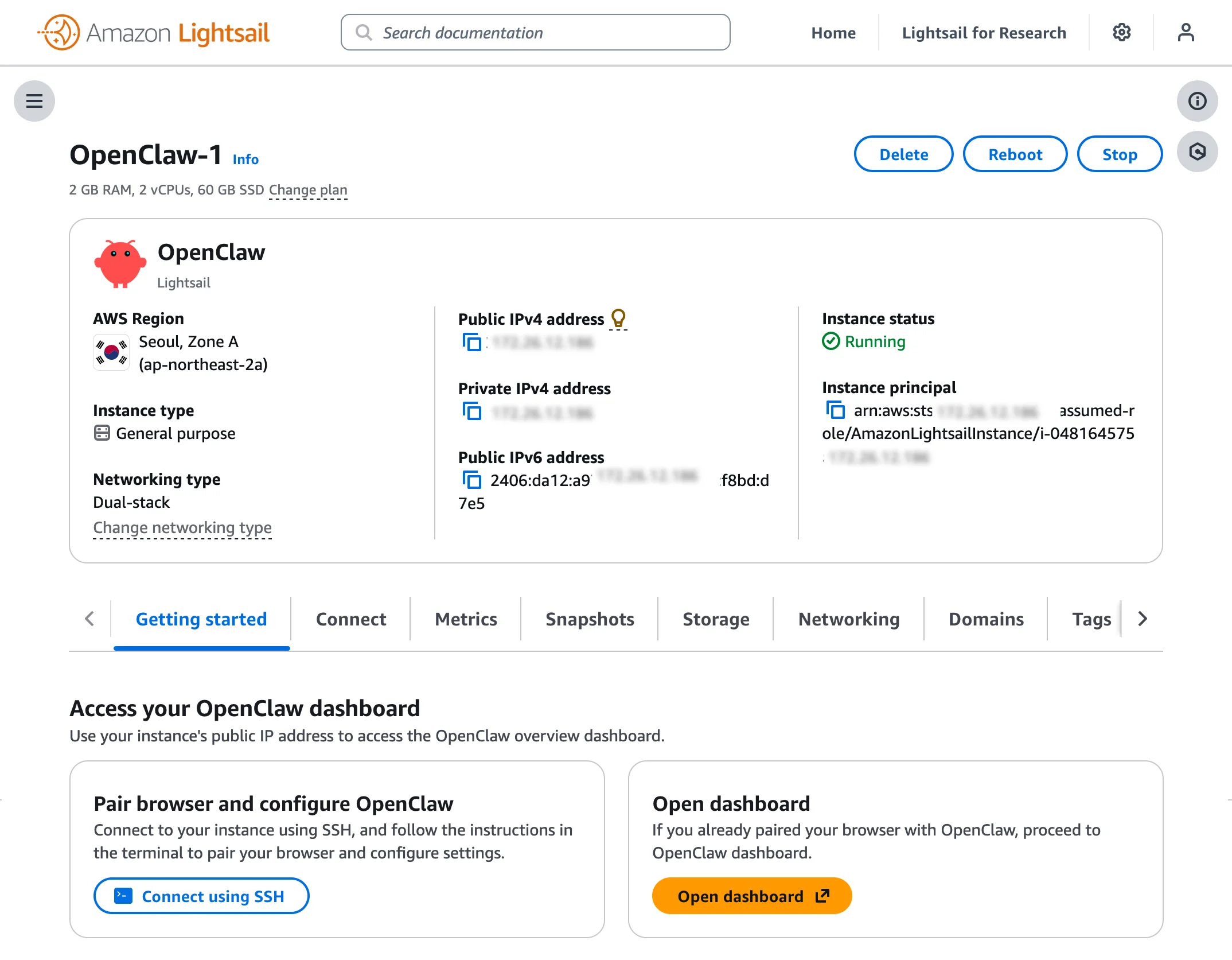 Before you can use the OpenClaw dashboard, you should pair your browser with OpenClaw. This creates a secure connection between your browser session and OpenClaw. To pair your browser with OpenClaw, choose Connect using SSH in the Getting started tab.