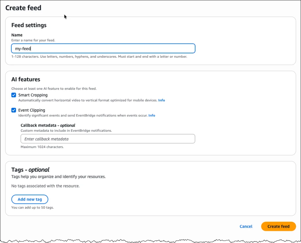 To get started with AWS Elemental Inference, navigate to the AWS Management Console and choose AWS Elemental Inference. From the dashboard, choose Create feed to establish your top-level resource for AI-powered video processing. A feed contains your feature configurations and begins in CREATING state before transitioning to AVAILABLE when ready.