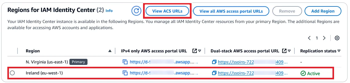 After the replication is completed, your users can access their AWS accounts and applications in this new Region. When you choose View ACS URLs, you can view SAML information, such as an Assertion Consumer Service (ACS) URL, about the primary and additional Regions.